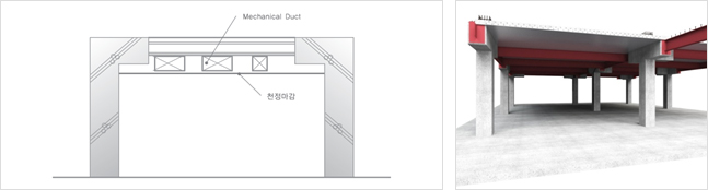 - 보 중앙부(철골보)는 단부에 비해 보 춤이 작아서 기계설비관련 배관 설치가 용이하고 층고절감이 가능